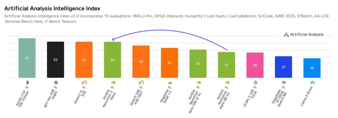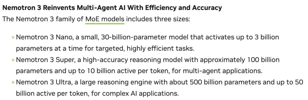 英伟达还推出了最新的Nemotron 3系列开源模型,模型采用MoE架构,支持百万token上下文窗口。