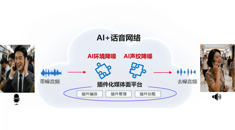 当前,用户在机场、地铁、商场等嘈杂环境中通话时,常因背景噪声干扰而影响沟通效率。尽管部分终端已具备端侧降噪能力,但此类能力依赖终端自身算力与算法,难以覆盖所有用户,无法实现所有用户的高品质通话体验。