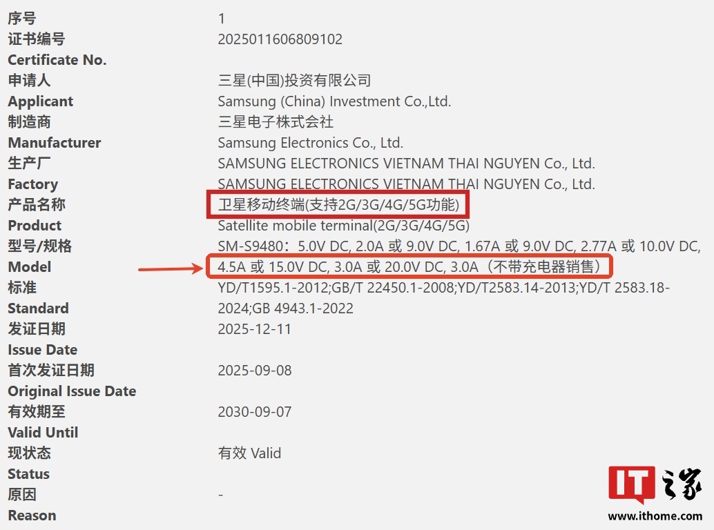 据IT之家此前报道,型号“SM-S9480”的三星卫星移动终端已现身中国质量认证中心,结合此前 GSMA IMEI 数据库信息,基本确认该机为三星 Galaxy S26 Ultra。该机的证书编号为 2025011606809102,最高支持 60W 有线充电。