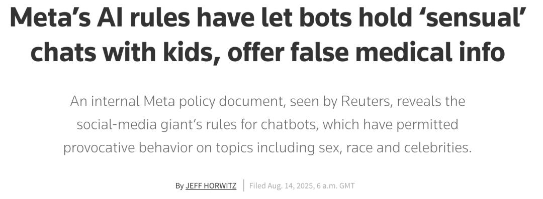2025年8月,Meta内部政策文档被曝光:允许AI聊天机器人与未成年人进行「感性」等话题互动,提供虚假医疗信息。