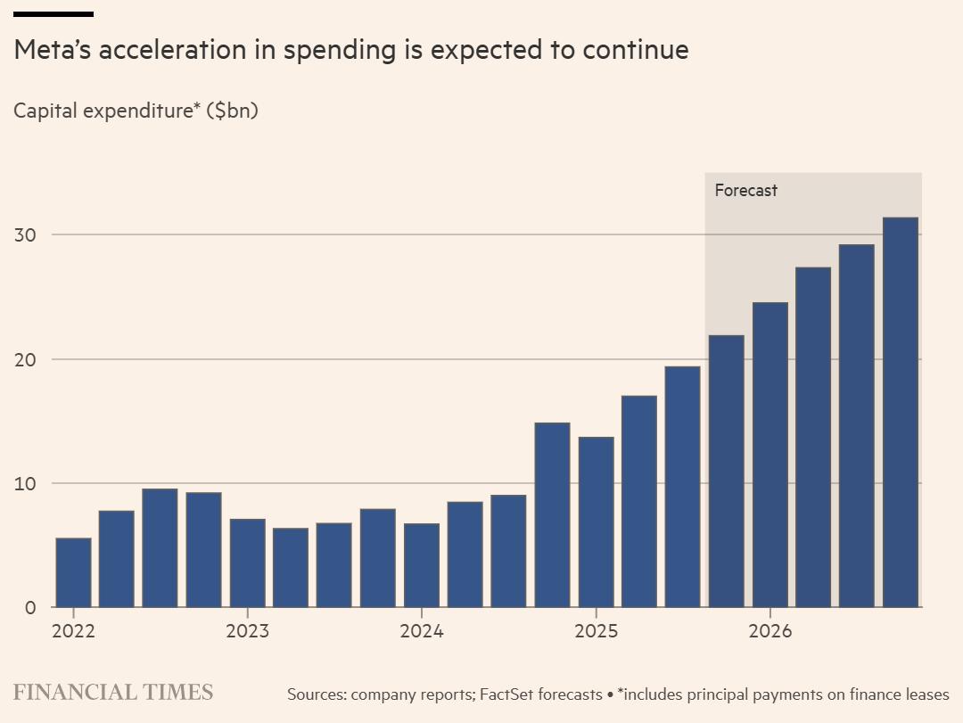 而2025年,Meta的资本支出预计将达到至少700亿美元,远高于上一年的390亿美元。