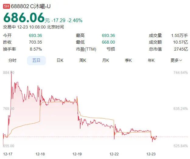 截至12月21日,沐曦股份股价为703.35元/股,总市值高达2745亿元。