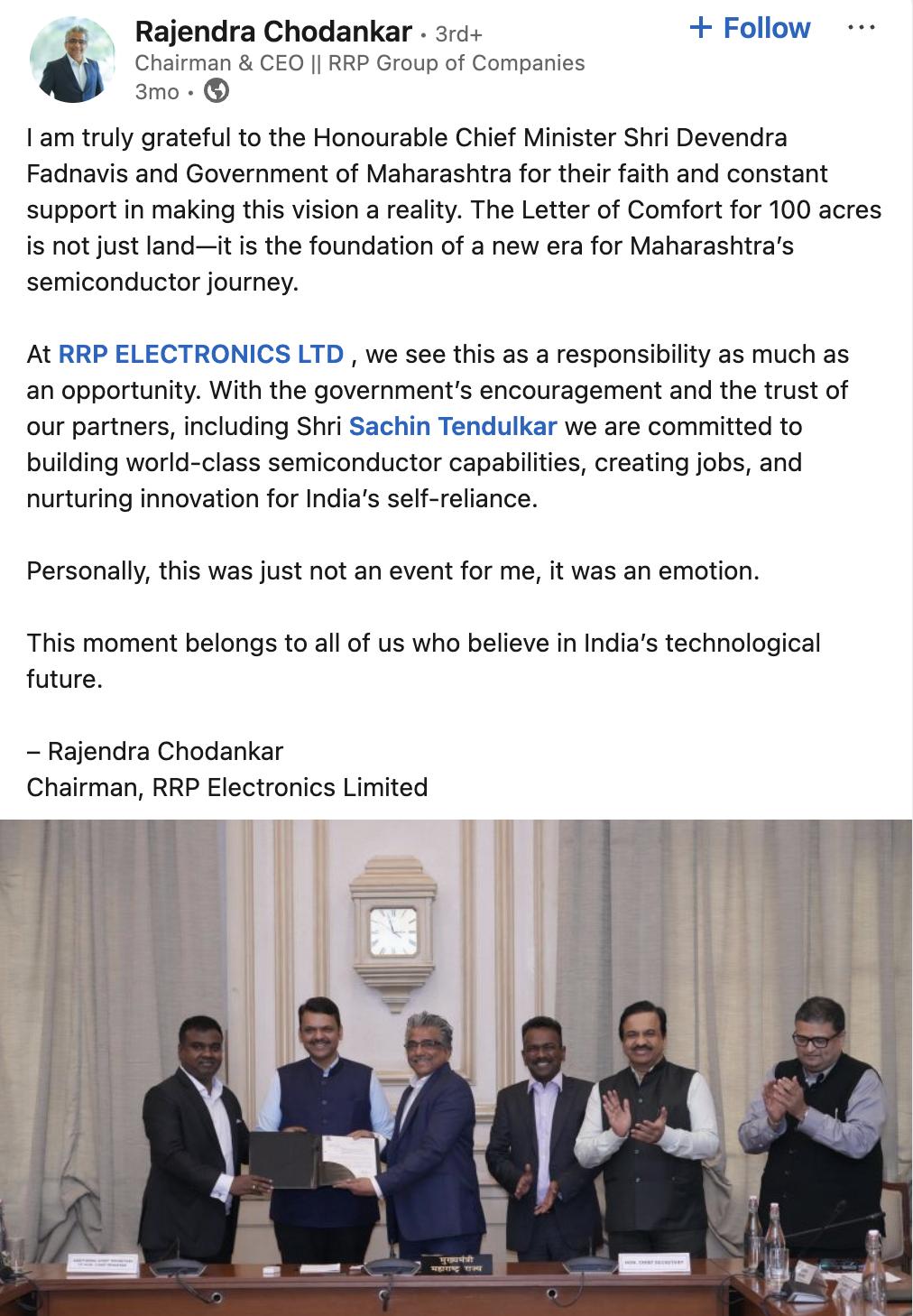 与此同时,RRP半导体还曾向警方报案,指控一名社交媒体网红散布谣言,称该公司与板球传奇Sachin Tendulkar存在关联,或获得了政府划拨的芯片制造用地。
