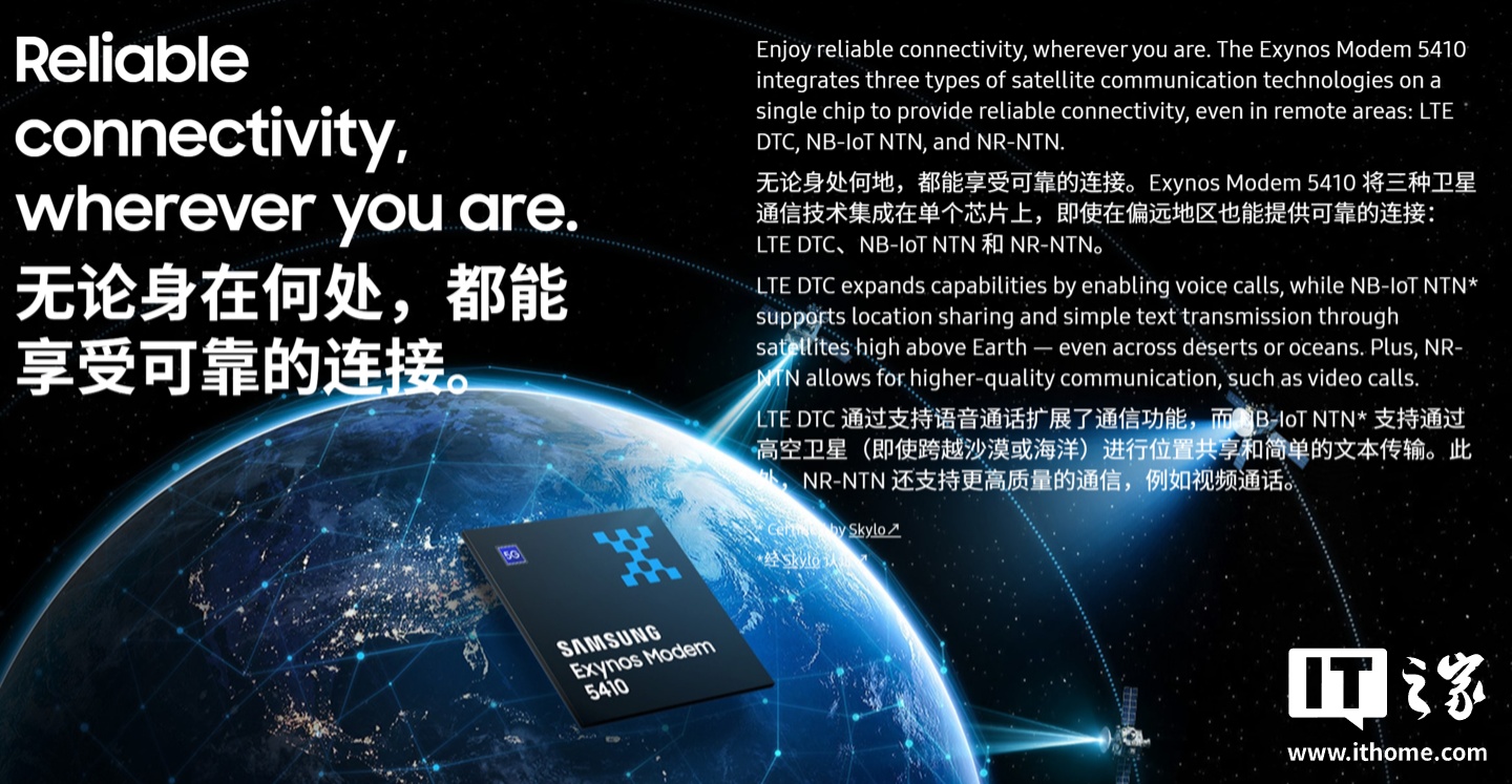 IT之家援引博文介绍,Exynos 5410 芯片全面支持 LTE DTC、NB-IoT NTN 以及 NR-NTN 三种卫星网络技术: