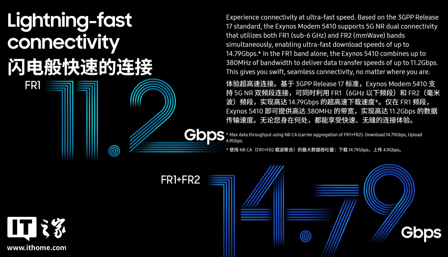 即便仅使用 FR1 频段,Exynos 5410 也能通过聚合高达 380MHz 的带宽,提供最高 11.2Gbps 的数据传输速率。