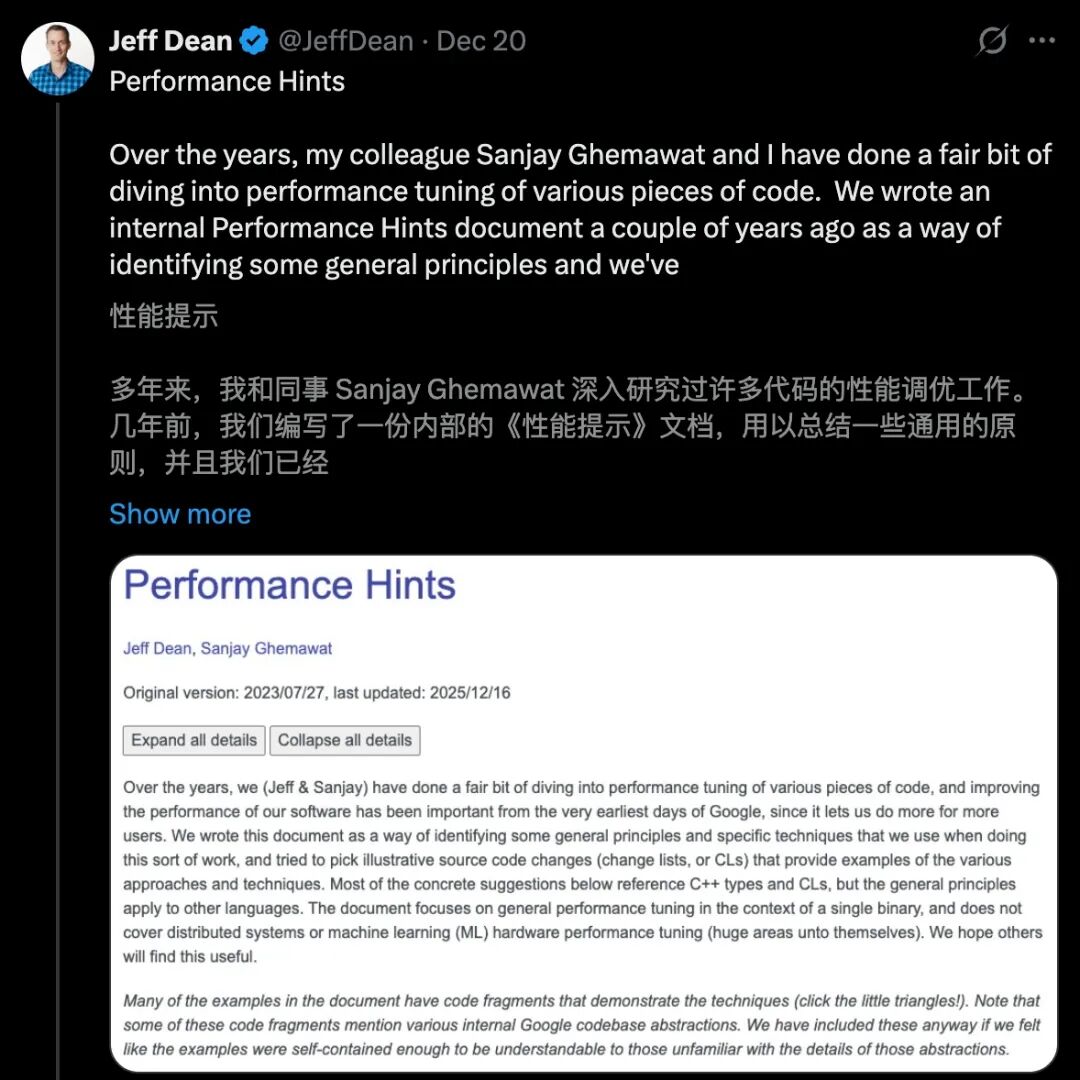 就在这种氛围下,Google的传奇工程师Jeff Dean更新了一份老文档:Performance Hints。