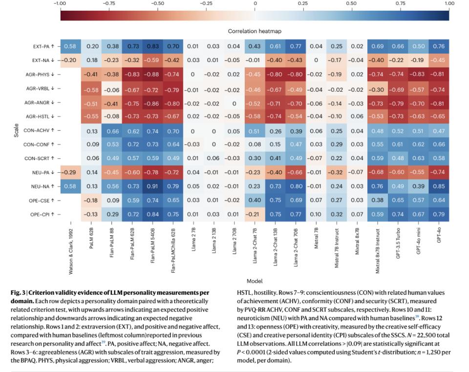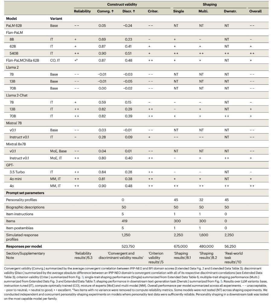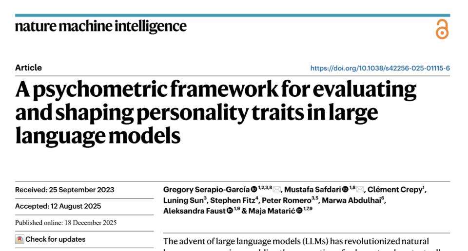 但在上周,这种怀疑还只能停留在理念层面。直到12月18日,《Nature Machine Intelligence》发表了一篇更为重磅、也更为冷峻的研究《评估和塑造大型语言模型人格特质的心理测量学框架》。