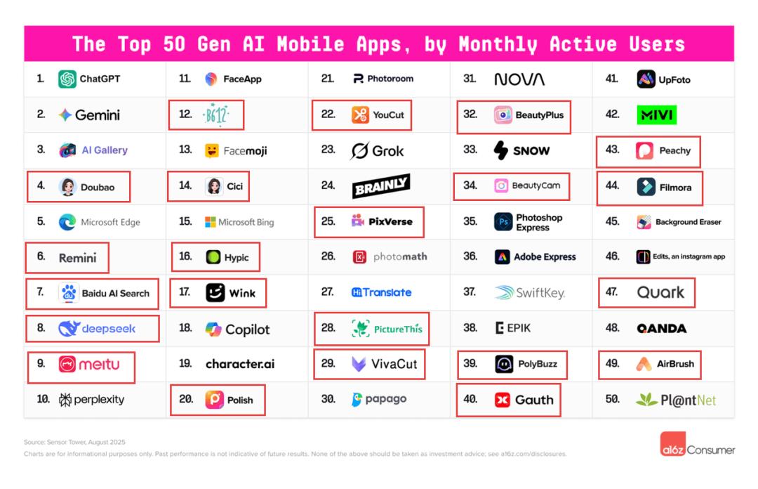 △A16Z“The Top 50 Gen AI Mobile Apps”2025年8月榜单,标红为华人团队开发的AI应用。图源:A16Z