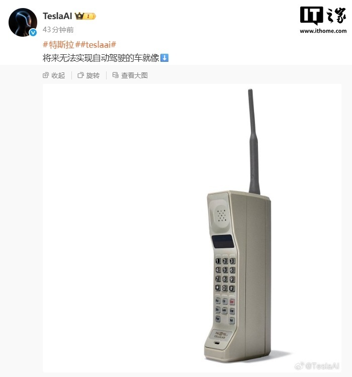 据IT之家此前报道,特斯拉官方账号 @TeslaAI 在 12 月 25 日发文称,将来无法实现自动驾驶的车就像(下图),配图为一部古董手机“大哥大”。12 月 17 日,特斯拉首席执行官埃隆・马斯克在社交网络上评价称,没有自动驾驶能力的燃油车,就像“骑着马用着翻盖手机”。