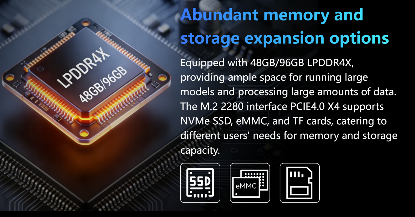 在存储与扩展性方面,AI Station 可选配 48GB 或 96GB 的 LPDDR4X 内存,并支持最高 256GB 的 eMMC 存储、MicroSD 卡以及通过 PCIe 接口连接的 M.2 SSD 固态硬盘。
