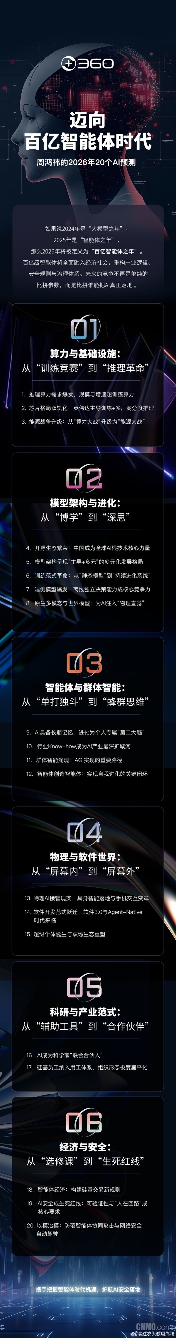 【CNMO科技消息】1月9日,360集团创始人周鸿祎发布2026年20个AI预测。他认为,如果说2024年是“大模型之年”,2025年是“智能体之年”,那么2026年将被定义为“百亿智能体之年”。百亿级智能体将全面融入经济社会,重构产业逻辑、安全规则与治理体系。未来的竞争不再是单纯的比拼参数,而是比拼谁能把AI真正落地。周鸿祎的2026年20个AI预测具体如下: