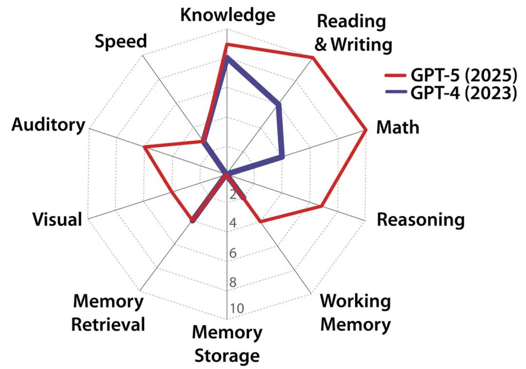 去年,图灵奖得主、AI三巨头之一Yoshua Bengio、谷歌前董事长Eric Schmidt在内的数十位知名学者与专家,受人类认知研究领域中Cattell–Horn–Carroll理论启发,为混乱的AGI预测领域提供了一个力求严谨的评估基准。