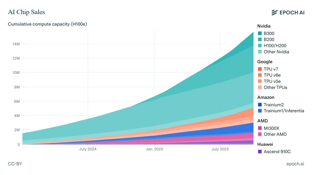 对此,顶级研究机构Epoch AI追踪了全球各大主流芯片设计厂商每个季度的AI加速芯片产量,揭示了这场军备竞赛的底牌。