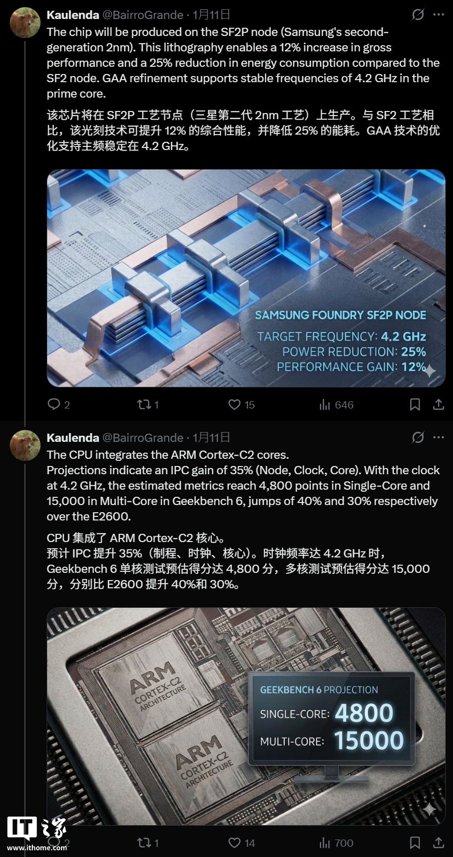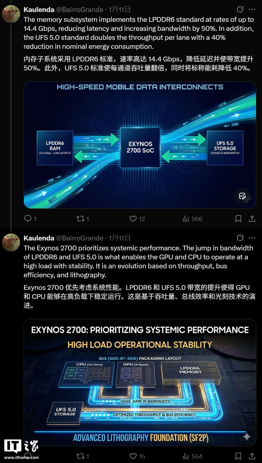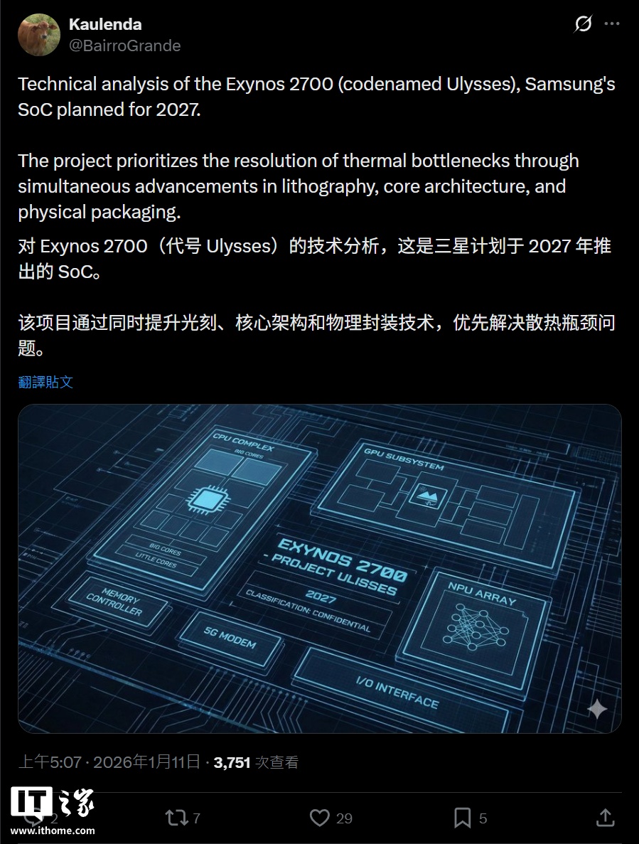 IT之家 1 月 12 日消息,消息人士 Kaulenda 昨天在 X 平台泄露了三星 Exynos 2700 芯片的规划设计,显示这款芯片将在制程工艺、核心架构、封装工艺等方面进行重大改进,有望 2027 年发布。