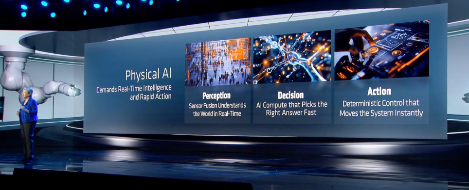 Generative Bionics CEO兼联合创始人Daniele Pucci分享了物理AI在仿生学领域的应用。该公司拥有20多年物理AI和生物力学研究经验,专注于生成式仿生学,需要快速、确定性和本地化的计算支撑触觉、平衡等功能,无法依赖云端——这正是与AMD合作的核心原因。AMD提供了从嵌入式边缘平台(Ryzen AI Embedded、Versal AI Edge)到CPU、GPU的全栈解决方案:嵌入式平台可在机器人上运行物理AI,CPU和GPU则为仿真、训练和大规模开发提供算力。