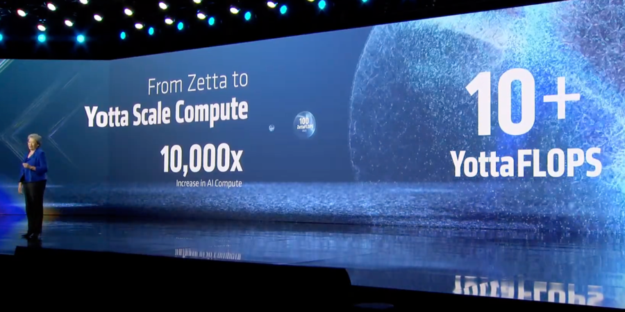 算力作为AI发展的基石,在过去几年也经历了飞跃式增长。苏姿丰公布了一组震撼的算力增长数据:AI基础设施的算力从2022年的1 Zettaflops,将增长到2025年的100 Zettaflops;未来数年全球计算能力将再提高100倍,并在未来五年达到10 Yottaflops,而这一数值是将2022年的一万倍。