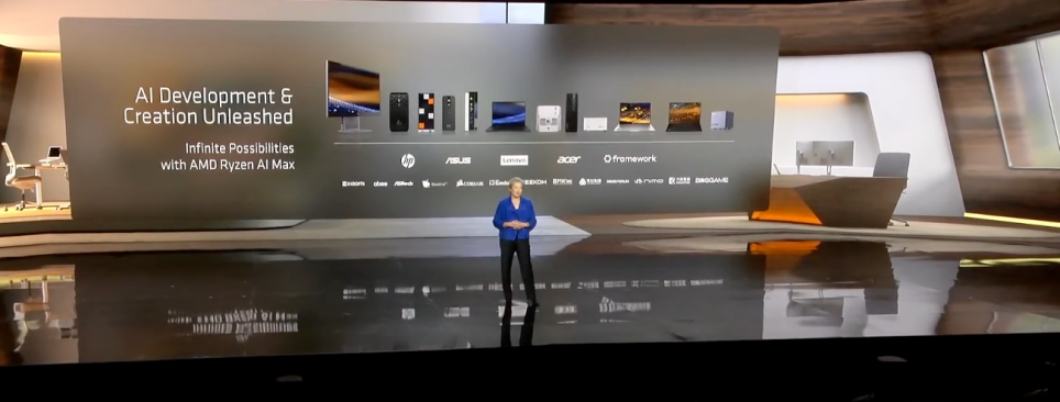 苏姿丰介绍,目前市场上已有超过30款搭载Ryzen AI Max的笔记本在售,一体机和紧凑型工作站产品将在CES发布,并于今年陆续上市。