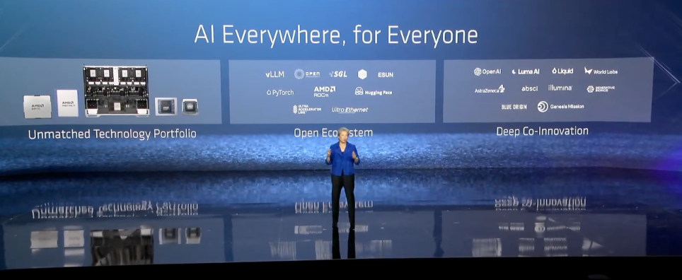 苏姿丰强调,硬件只是AI的一部分,开放生态对AI未来至关重要。“历史经验证明,只有行业团结起来,围绕开放的基础设施和共享的技术标准达成一致,创新速度才能加快。AMD是唯一一家在整个技术栈上实现开放的公司,涵盖软硬件及更广泛的解决方案生态系统”。