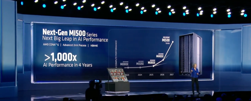 苏姿丰也透露,为持续满足增长的算力需求,AMD不会止步于MI400系列。目前MI500系列研发顺利,将实现AI性能4年提升1000倍的飞跃。该系列采用下一代CDNA6架构,基于2nm工艺制造,搭载速度更快的HBM4e内存,将于2027年推出。