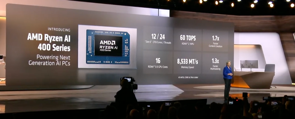 演讲现场,苏姿丰宣布推出全新Ryzen AI 400系列处理器,该处理器配备12个高性能Zen5 CPU核心、16个RDNA 3.5 GPU核心和最新XDNA2 NPU,可提供60 TOPS的AI算力。