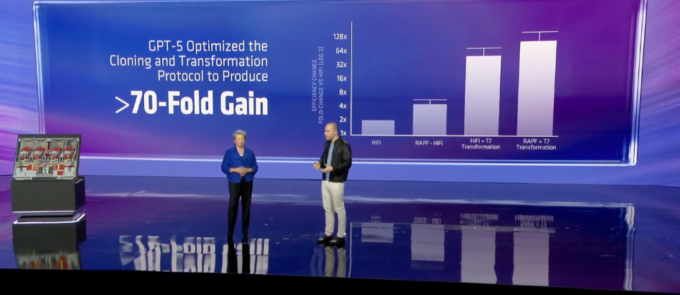 阿斯利康AI负责人Ola分享了在同AMD合作的基础上,企业通过整合数十年实验室数据训练生成式AI模型,可在计算机上模拟评估候选药物,将小分子药物研发的候选药物交付速度提高50%,同时提升临床成功率。