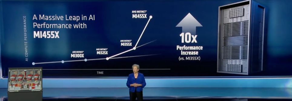 苏姿丰确认,Helios将于今年晚些时候推出。半年以前,AMD推出MI355时,吞吐量较上一代提高3倍,而此次发布的MI455性能提升高达10倍。