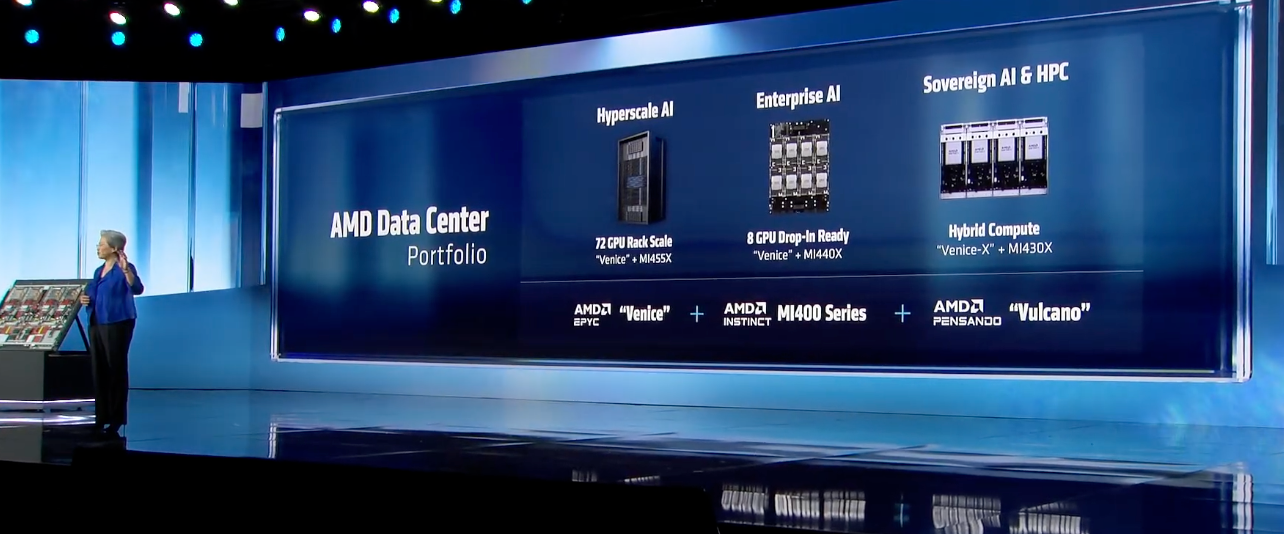 三是面向主权AI+HPC的方案,采用Venice-X CPU+MI430X系列加速器,为高精度科学和AI数据类型提供领先的混合计算能力。