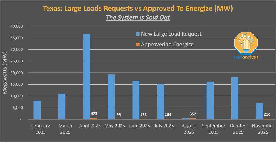SemiAnalysis的跟踪数据显示,目前在得克萨斯州,每个月都有几十吉瓦的数据中心用电申请,但电网能批下来的只有1吉瓦出头。