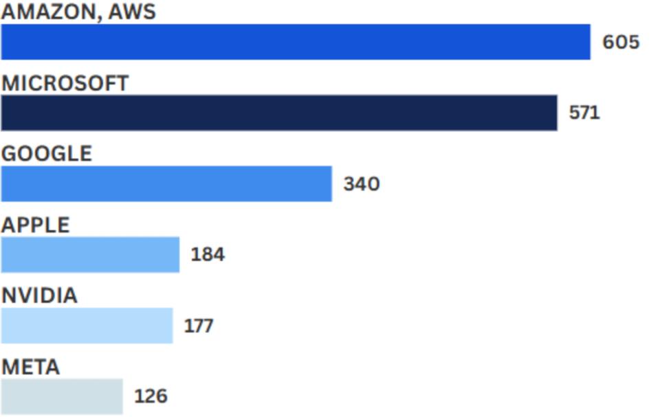 亚马逊(包括云计算部门AWS)势头最猛,相关招聘已达605人。