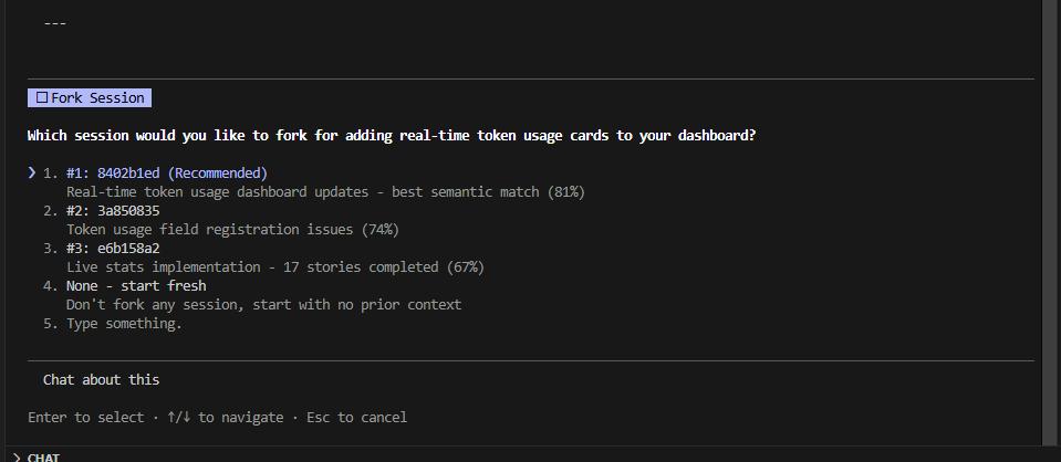 只需要调用 /fork-detect 命令,告诉它你现在想做什么,Claude就会把你的需求送进嵌入模型;然后,和一个包含你所有历史聊天记录的RAG向量数据库进行匹配(而且,这个数据库会随着你新的会话自动更新)。