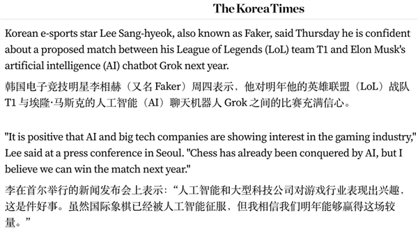 Faker 认为虽然国际象棋已经被 AI 征服了,但他依旧对战胜 Grok 信心十足。
