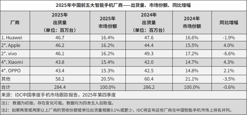 现在,5 年之后,华为手机终于重回中国智能手机市场第一。三家主流市场研究机构 IDC、Omdia 以及 Counterpoint 公布的统计数据均显示,在 2025 年中国智能手机全年出货量同比微降的趋势下,华为超越苹果拿下市场第一。