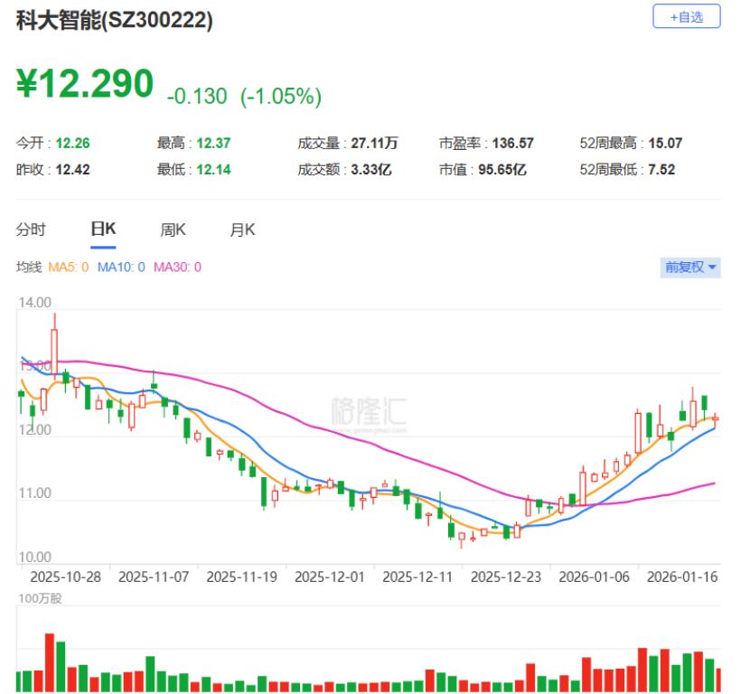 早在2011年,科大智能(300222.SZ)就实现创业板上市,截至2026年1月21日收盘,公司股价为12.29元/股,市值95.65亿元。
