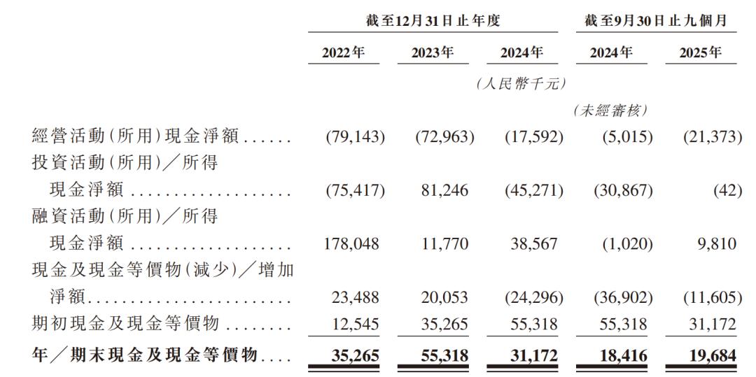 2025年前九个月,该公司经营活动所用现金净额为-0.21亿元,主要归因于税前亏损0.37亿元。2022年至2025年前九个月,该公司的经营活动所用现金净额持续为负。