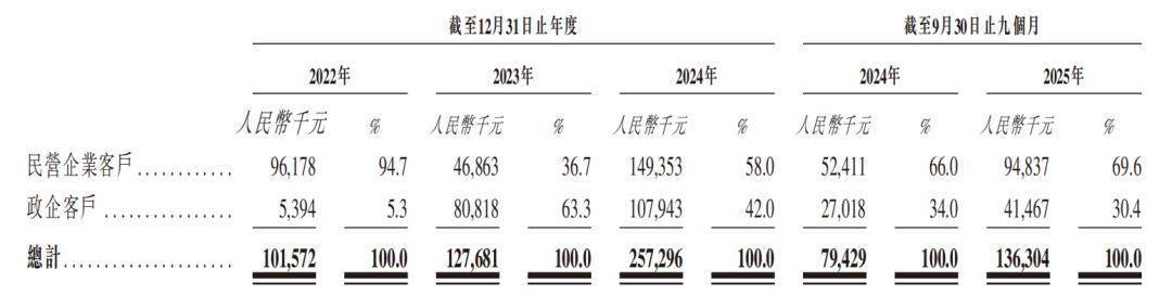 按客户类型划分,2022年、2023年、2024年全年及2025年前九个月,极视角在民营企业客户的毛利率分别为30.5%、45.7%、47.3%及48.5%;政企客户收入占比分别为32.5%、14.4%、30.4%及36.5%。