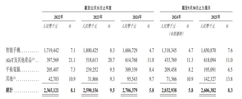 按照产品类型划分收入,可以划为智能手机、AIoT及其他产品、平板电脑等。