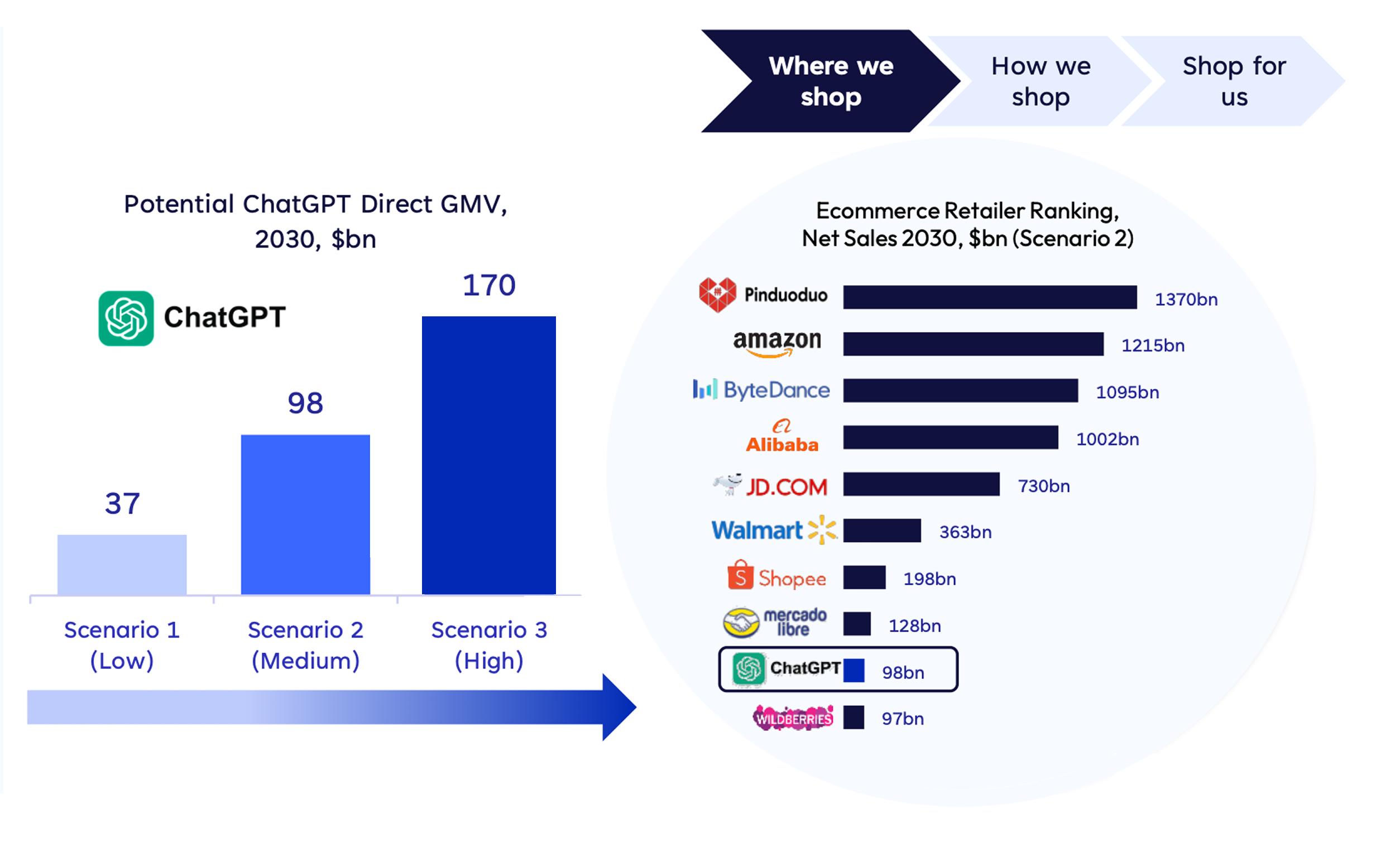 尽管无法完全确定ChatGPT作为零售平台的未来走向,但根据Flywheel飞未模型预测,假设到2030年ChatGPT可以获取当前Google约50%的网页流量,其电商规模足以撼动现有格局。届时,其GMV在2030年最高有望突破1700亿美元,跻身全球前十电商平台。