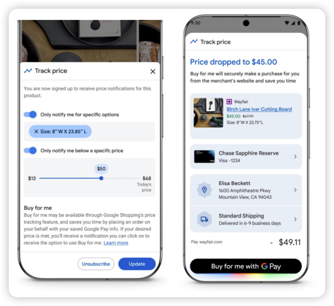 此外,用户可以让Gemini帮忙“持续追踪产品的价格”,以免因产品降价而错过购买时机。例如,用户要购买一个砧板,可以先设置砧板的尺寸(8*25英寸)和价格区间(13-50美元),当该产品的价格达到用户的期望值(比如45美元),Gemini就会通知用户下单。