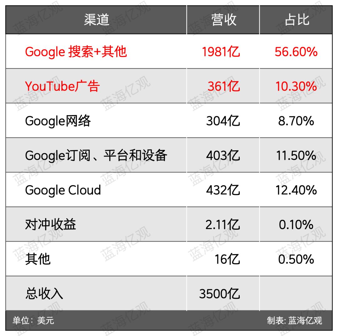 谷歌的核心收入来源是广告(包括“购物广告”),2024年,谷歌母公司Alphabet总营收3500亿美元,其中,来自搜索与Youtube的广告收入,合计占比约66.9%。