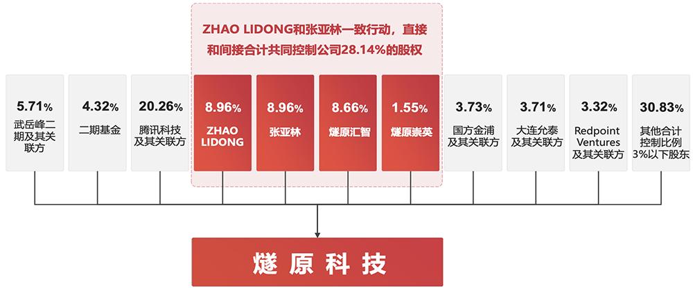 燧原科技创始人及实际控制人赵立东、张亚林合计直接持股17.9287%,通过燧原汇智与燧原崇英两个员工持股平台间接控制公司10.2070%的股权,合计控制公司28.1357%的股权。