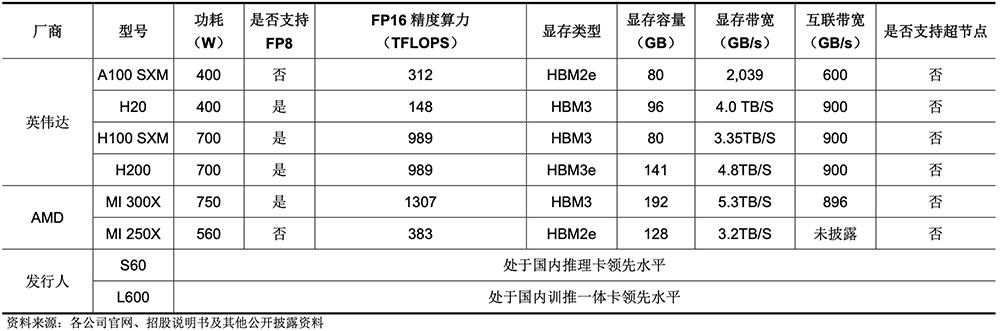 其与英伟达、AMD的AI加速卡及模组的规格比较如下: