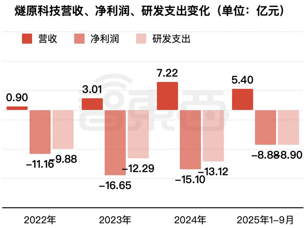 2022年、2023年、2024年、2025年1-9月,燧原科技营收分别为0.90亿元、3.01亿元、7.22亿元、5.40亿元,净利润分别为-11.16亿元、-16.65亿元、-15.10亿元、-8.88亿元,研发费用分别为9.88亿元、12.29亿元、13.12亿元、8.90亿元,尚未实现盈利。
