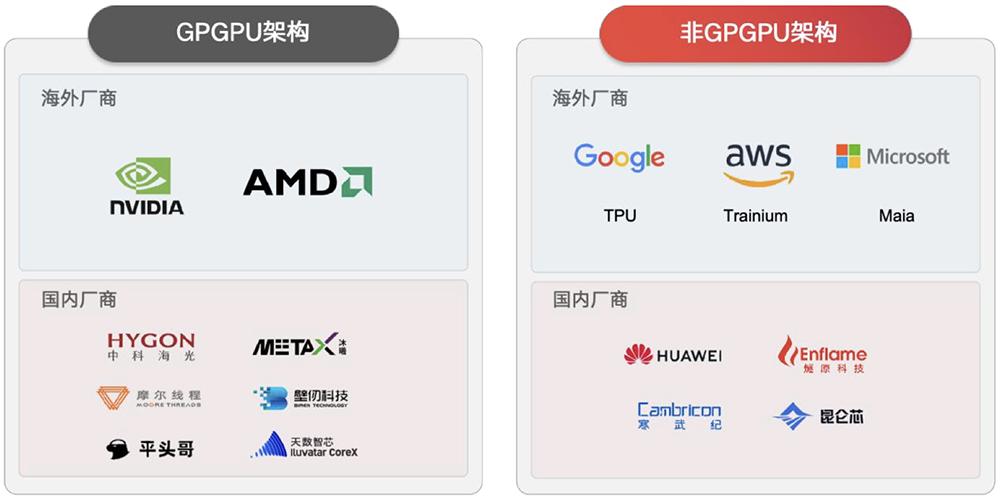 国内云端AI芯片行业处于发展初期。中国本土云端AI芯片厂商包括以华为海思、寒武纪、燧原科技、昆仑芯等为代表的非GPGPU架构厂商,和以海光信息、摩尔线程、沐曦股份、天数智芯、壁仞科技、平头哥等为代表的GPGPU架构厂商。