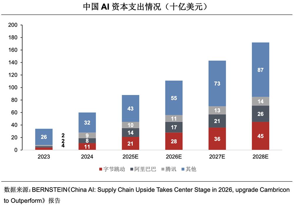 根据BERNSTEIN预测,到2028年,字节跳动、阿里巴巴、腾讯的AI资本支出将占据中国AI资本支出的近50%,凸显了进入头部互联网厂商供应链对AI加速卡供应商的重要性。