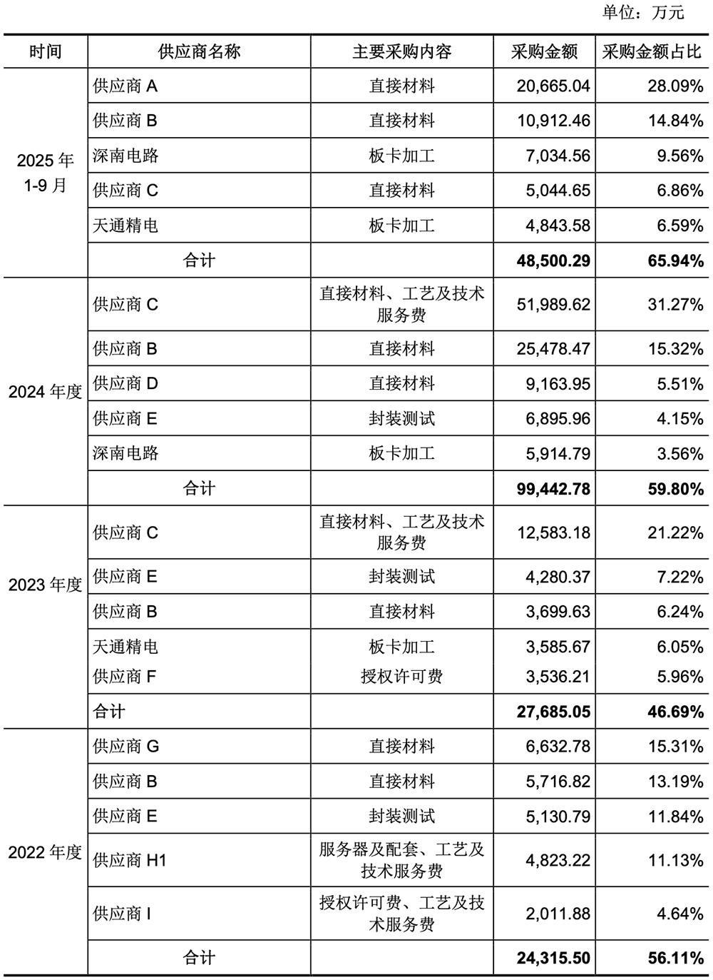 2022年、2023年、2024年、2025年1-9月,燧原科技向五大供应商的采购额分别占总采购额的56.11%、46.69%、59.80%、65.94%。