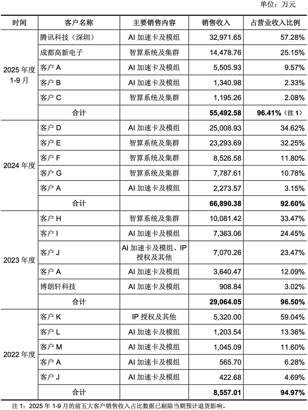 2022年、2023年、2024年、2025年1-9月,燧原科技对前五大客户的销售金额占当期营收的比例分别为94.97%、96.50%、92.60%、96.41%,其中对腾讯科技(深圳)的销售金额(包括直接销售和AVAP模式销售)占比分别为8.53%、33.34%、37.77%、71.84%,客户集中度较高。