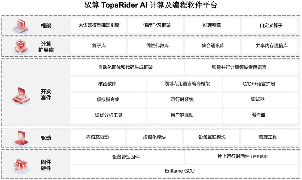 软件平台层面,该公司未跟随英伟达主导的CUDA生态,自研了包括驱动程序、编译语言与编译器、算子库、工具链的全栈AI计算及编程软件平台“驭算TopsRider”,以链接公司硬件与AI应用程序,大大降低了基于公司硬件的主流AI模型的编程开发难度和迁移成本。
