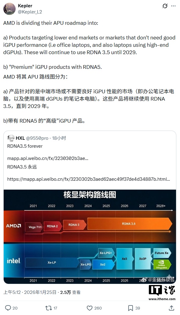 @9550pro 将其搬运到了 X 上,然后爆料者 @Kepler_L2 指出了其中一个误区,并对 AMD 未来 APU 产品线中 iGPU 图形架构规划进行了更为细致的说明。