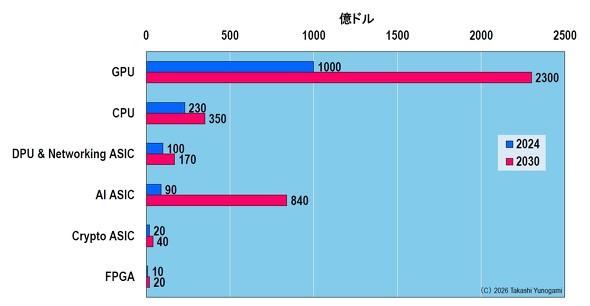 图7:数据中心逻辑预测(2024 → 2030 年)。来源:作者根据 Yole Group 的预测数据制作