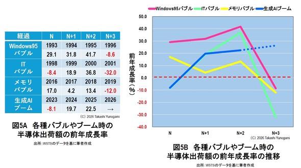 图5A通过对比表形式,呈现了Windows 95泡沫、IT泡沫、内存泡沫及当前AI热潮(暂统称“热潮”)从第N年到第N+3年的同比增速变化;图5B则进一步量化了这一波动:Windows 95泡沫期间增速达41.7%,随后骤降至-8.6%;IT泡沫增速36.8%,后续跌至-32.0%;内存泡沫增速13.4%,继而滑落至-12.0%。这种“繁荣后迅速萧条”的剧烈波动,正是过往泡沫的典型特征。